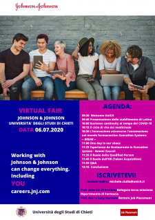 Si invitano tutti gli studenti e neolaureati in Farmacia e CTF a partecipare alla giornata dedicata al progetto "Virtual Fair" del 6 luglio dalle ore 9.30, organizzato dai Proff. Antonio Di Stefano e Ivana Cacciatore in collaborazione con Johnson & Johnson. L'evento vede protagonisti l'Università "G. d'Annunzio" di Chieti - Pescara e l'azienda Johnson & Johnson, la quale dedicherà la giornata alla presentazione dello stabilimento di Latina, descriverà la realtà lavorativa di J&J, si avrà la possibilità di ascoltare il punto di vista dei responsabili della selezione del personale, individuare le posizioni aziendali richieste, con importanti risvolti in merito al tema del recruitment.